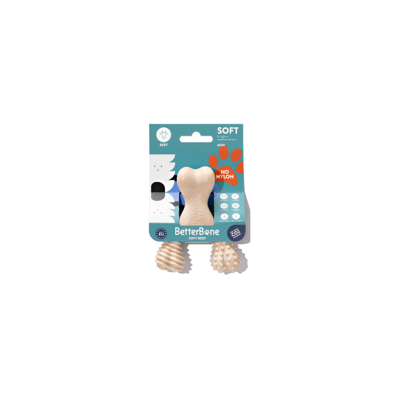 Kości BetterBone Mini o smaku wołowiny przeznaczone są dla psów ras małych i miniaturowych do 7 kg, a dzięki twardości SOFT będą odpowiednie dla ząbkujących szczeniąt, seniorów i psów o wrażliwych zębach.